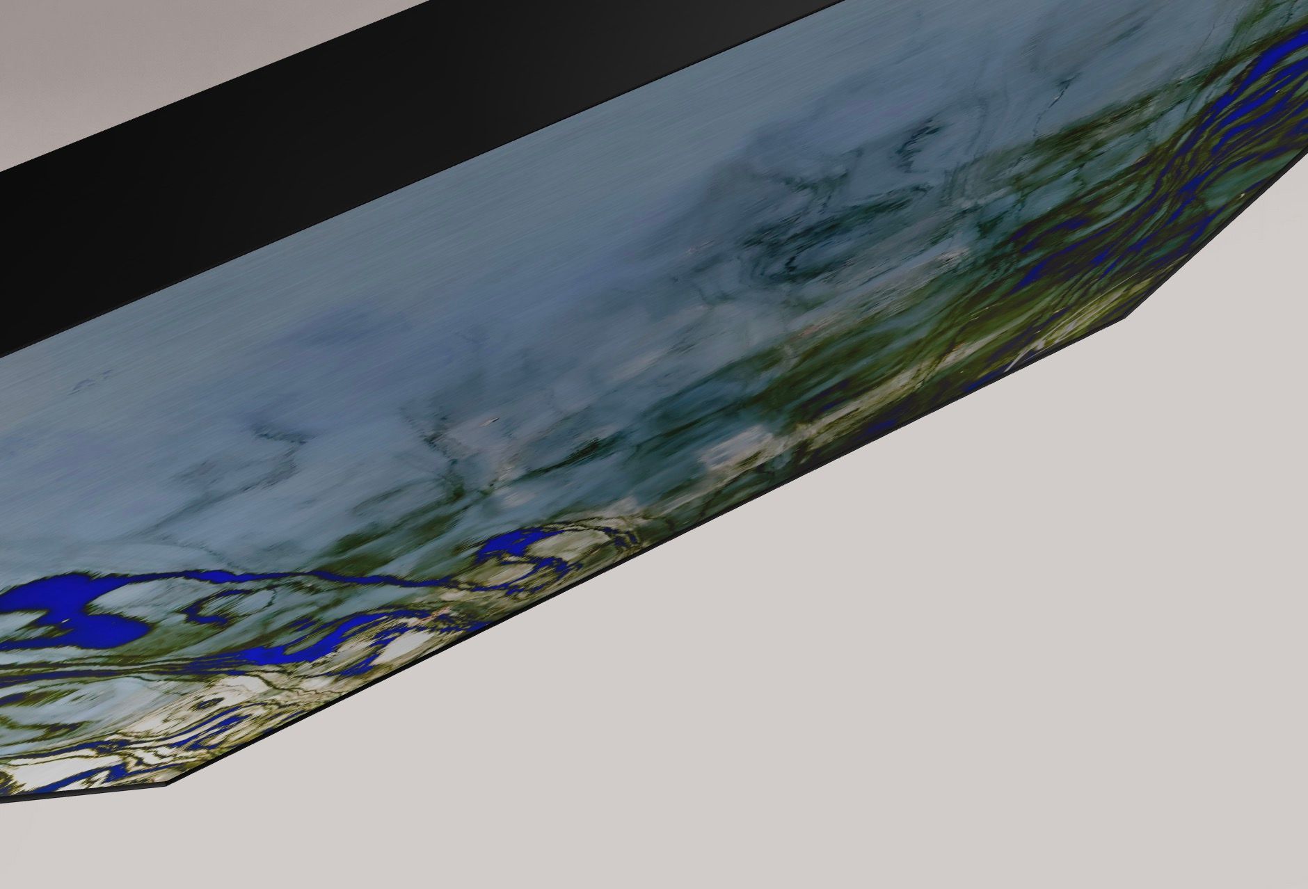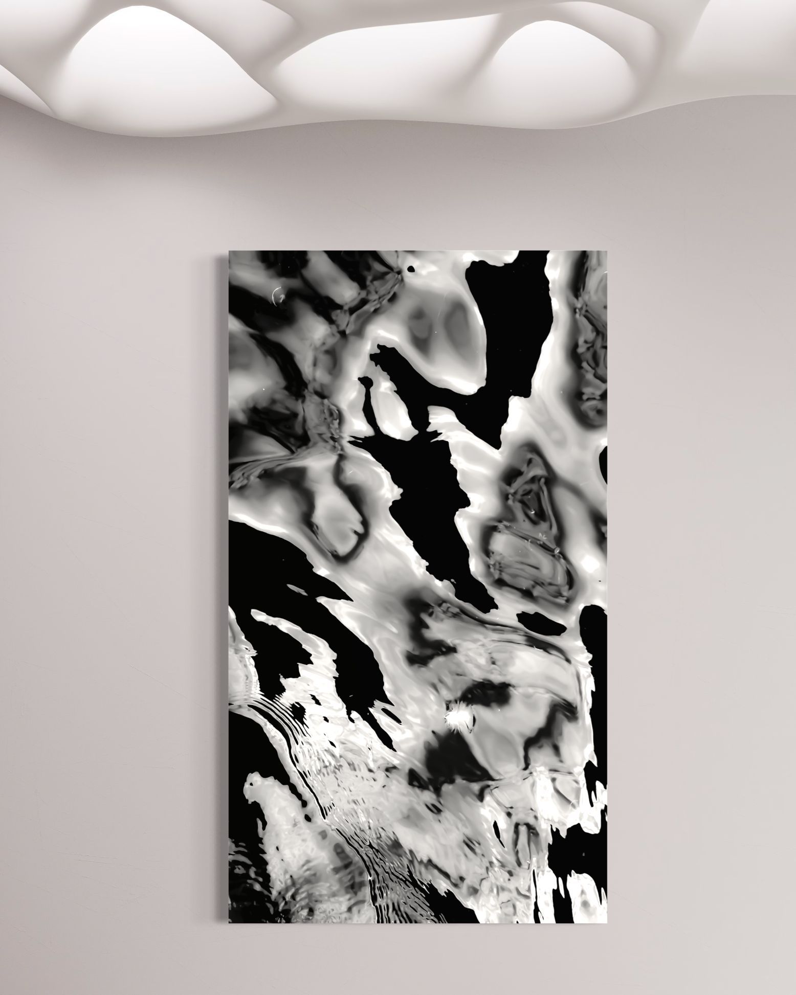 Als Leinwand dient Metall, ein sich stets wandelnder Träger, dessen Spiegelungen an das Wasser erinnern, aus dem hier die Inspiration für das Bild und die Musik stammt.