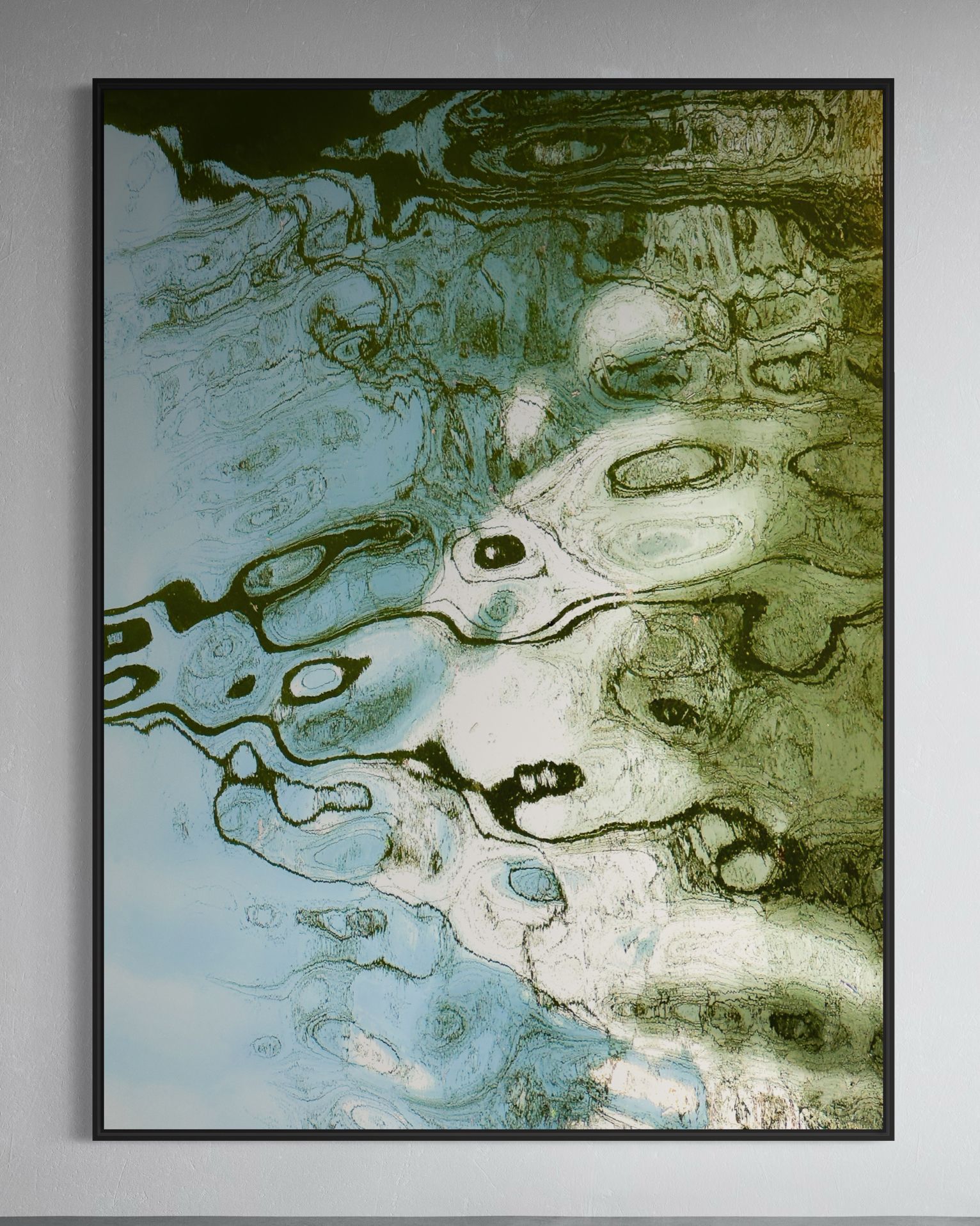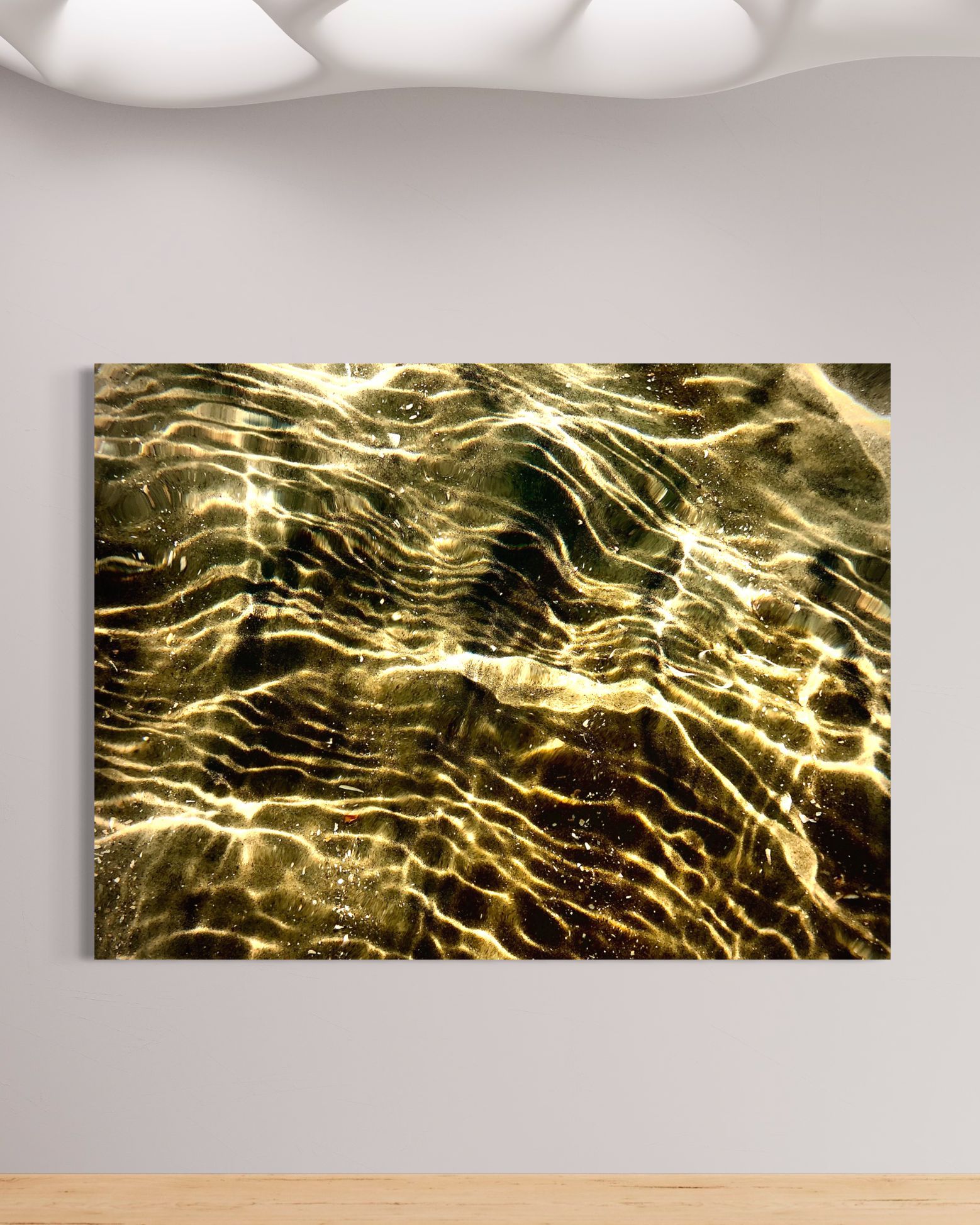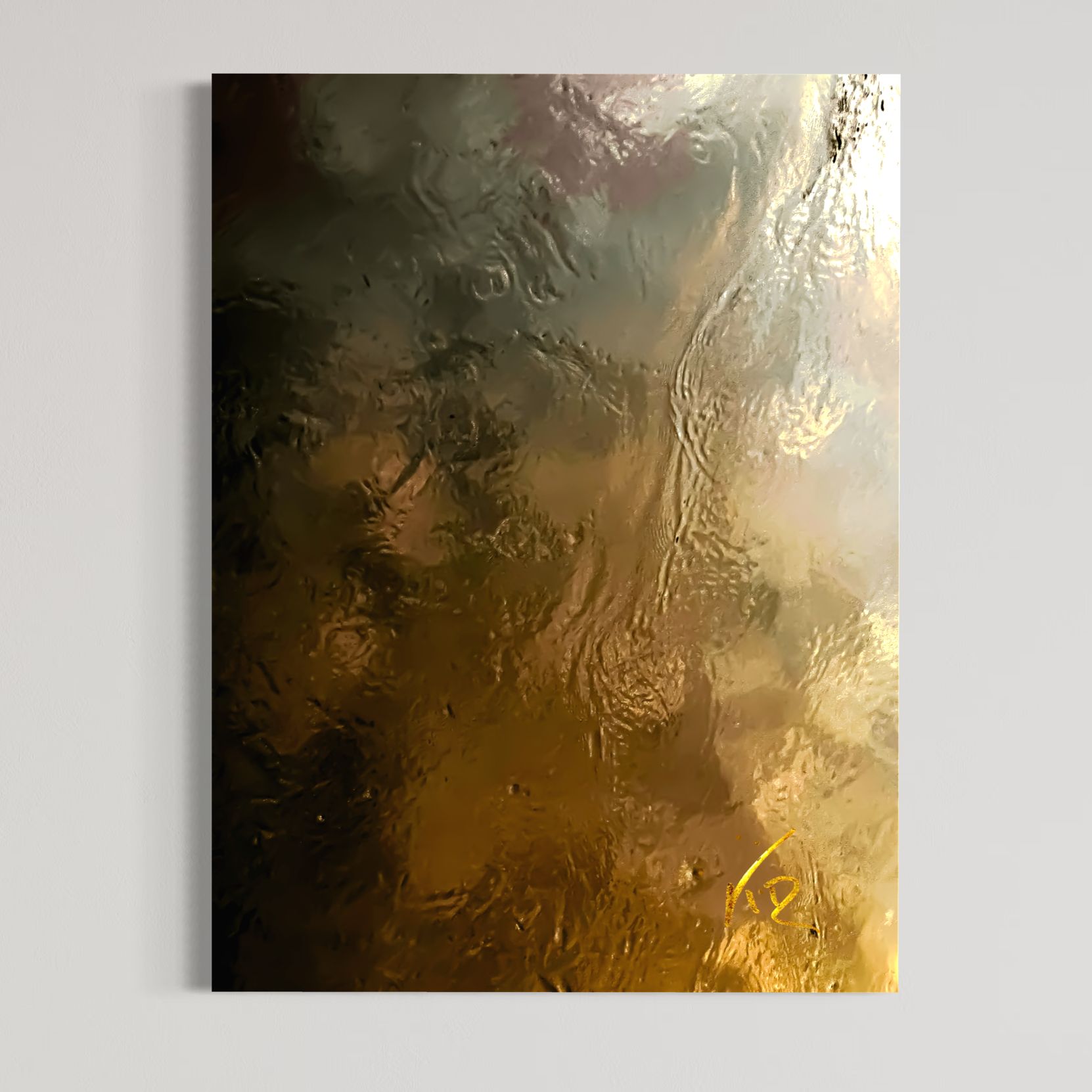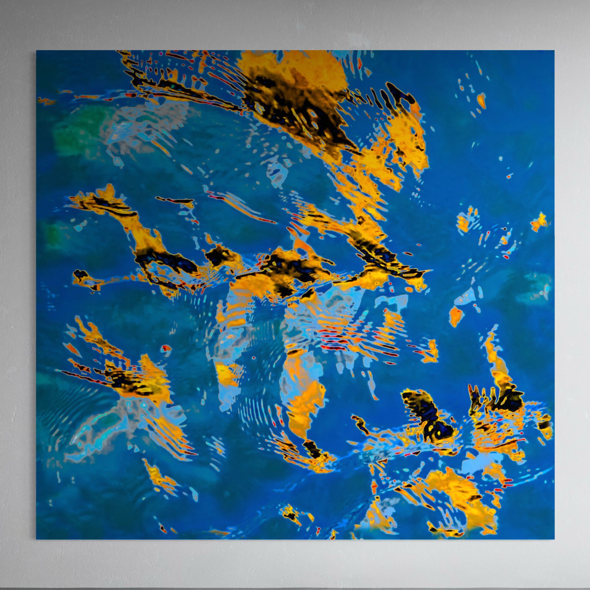 Das Wasser, in seiner Gestalt wie eine sich ständig wandelnde Leinwand aus Licht, Bewegung und Reflexion, ist die Grundlage der neuen Serie „Wo das Licht im Wasser wohnt“. Als Leinwand kommt hier Metall zum Einsatz, ein sich stets wandelnder Träger, dessen Spiegelungen an das Wasser erinnern, aus dem hier die Inspiration für die Bilder und die Musik stammen. Eigene Aufnahmen von Wasseroberflächen werden künstlerisch bearbeitet und anschließend durch Druck und mit gelösten Pigmenten mehrschichtig auf das Metall übertragen und von da an mit Farben, Tinten, Pigmenten und unterschiedlichen Maltechniken weitergeführt – bis es seine Vollendung erreicht hat.