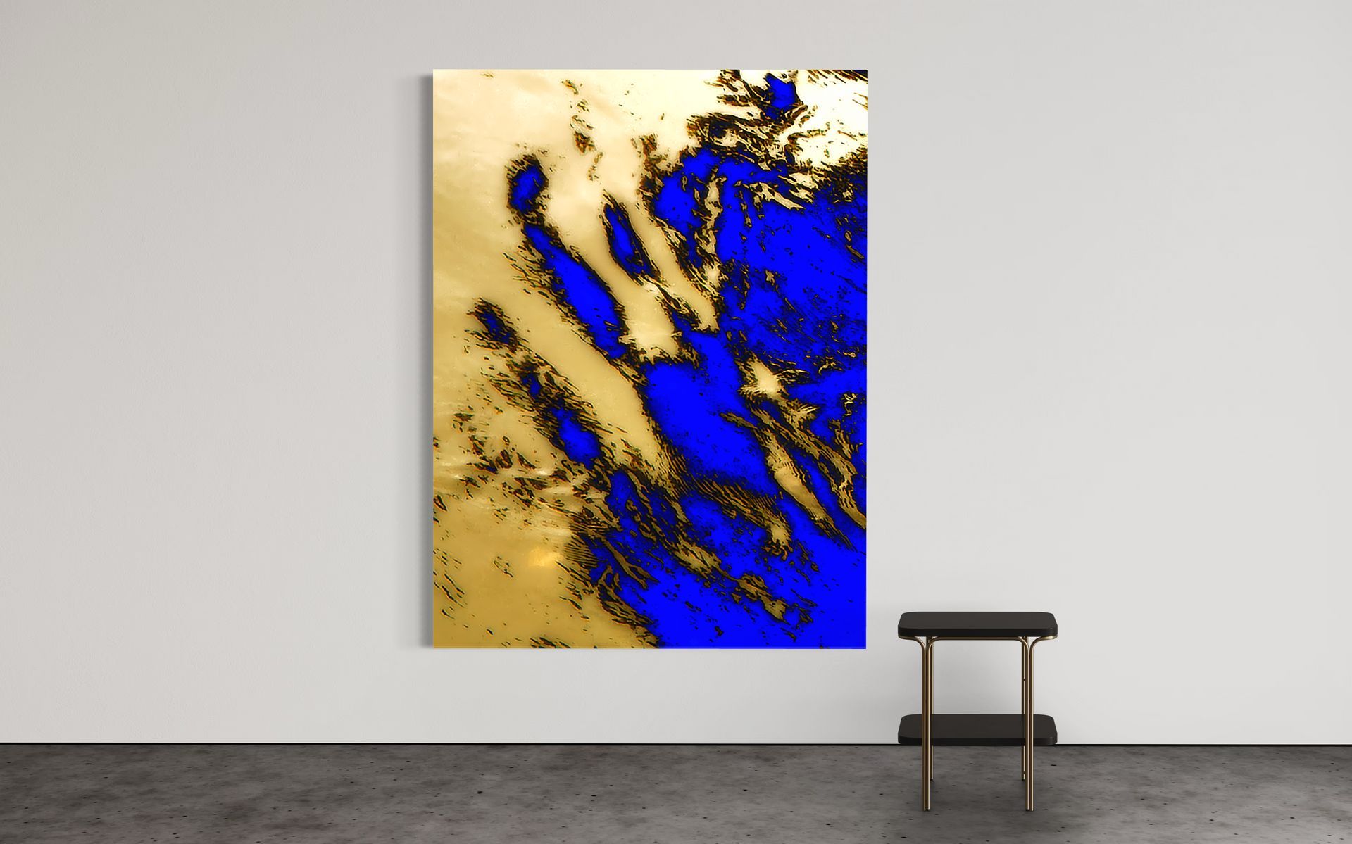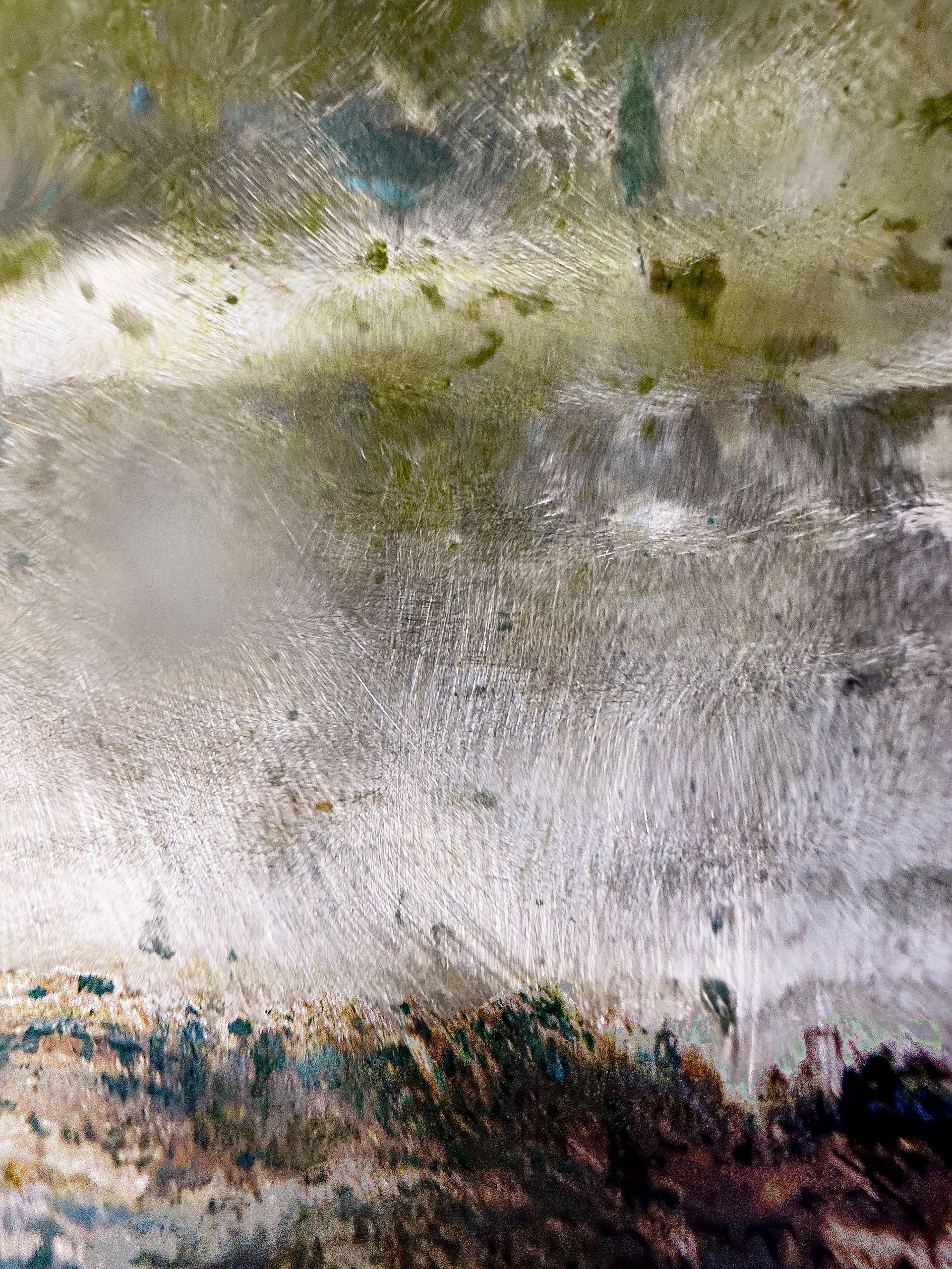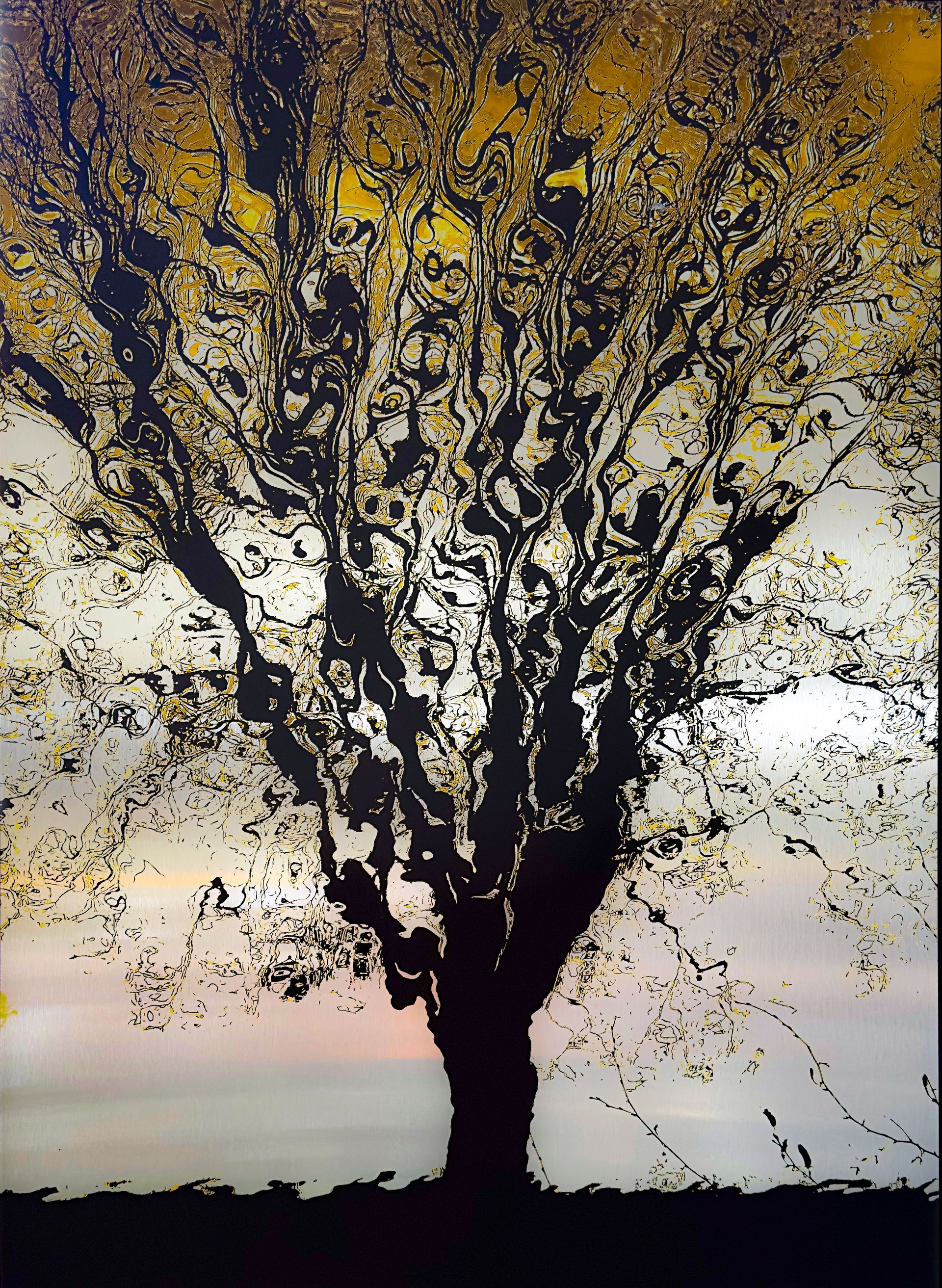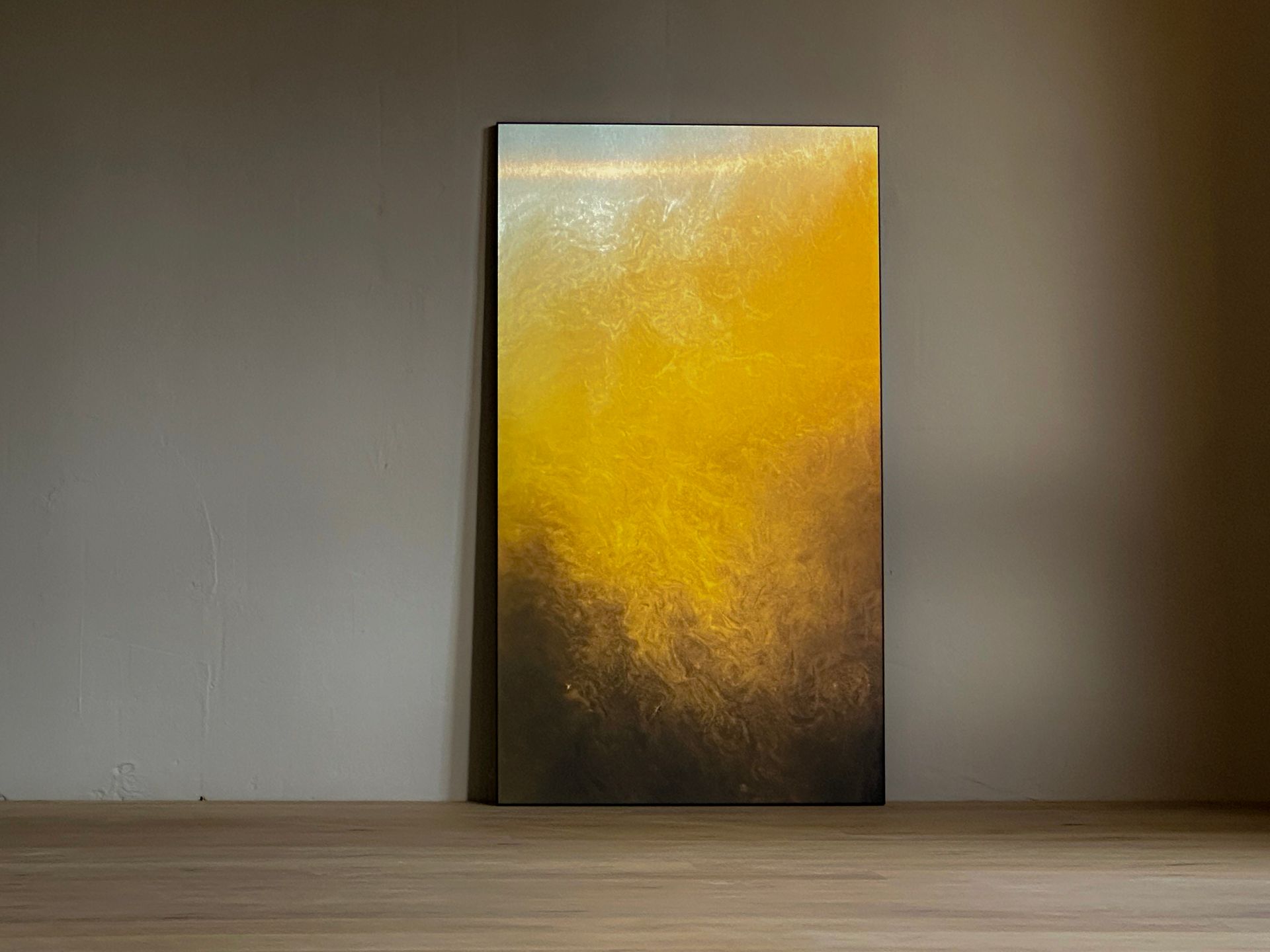 Das Wasser, in seiner Gestalt wie eine sich ständig wandelnde Leinwand aus Licht, Bewegung und Reflexion, ist die Grundlage der neuen Serie „Wo das Licht im Wasser wohnt“. Als Leinwand kommt hier Metall zum Einsatz, ein sich stets wandelnder Träger, dessen Spiegelungen an das Wasser erinnern, aus dem hier die Inspiration für die Bilder und die Musik stammen. Eigene Aufnahmen von Wasseroberflächen werden künstlerisch bearbeitet und anschließend durch Druck und mit gelösten Pigmenten mehrschichtig auf das Metall übertragen und von da an mit Farben, Tinten, Pigmenten und unterschiedlichen Maltechniken weitergeführt – bis es seine Vollendung erreicht hat.