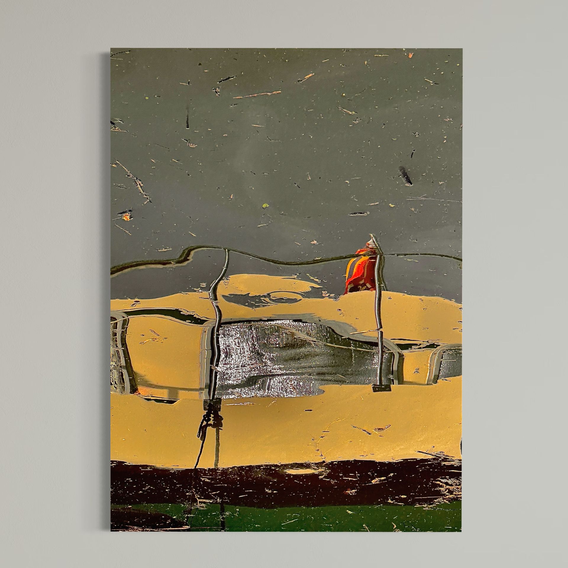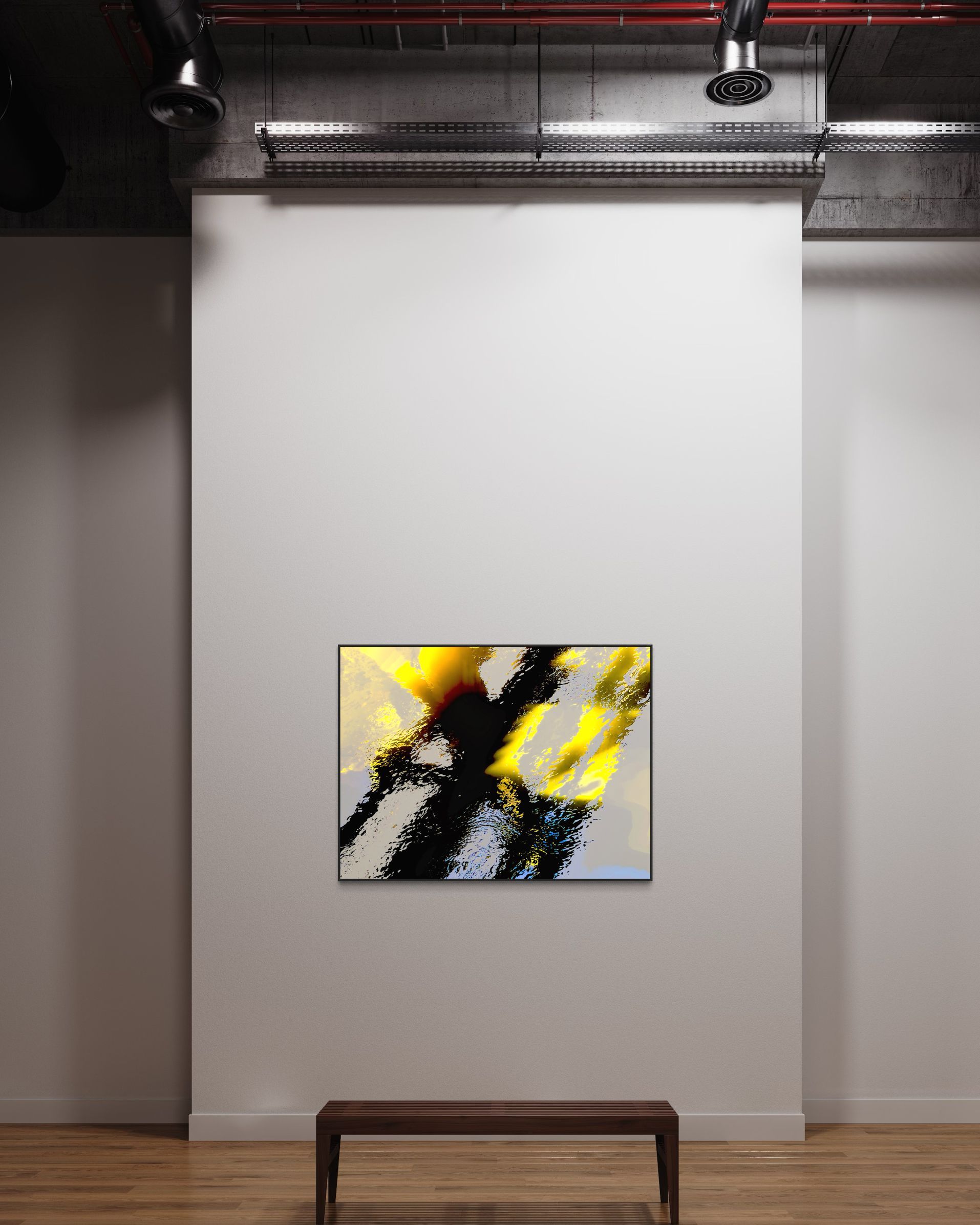 Die Oberfläche aus Metall trägt das Licht, bricht es, hält es fest. Gelb und Schwarz bilden ein Spannungsfeld, in dem Reflexe wandern und sich verändern.