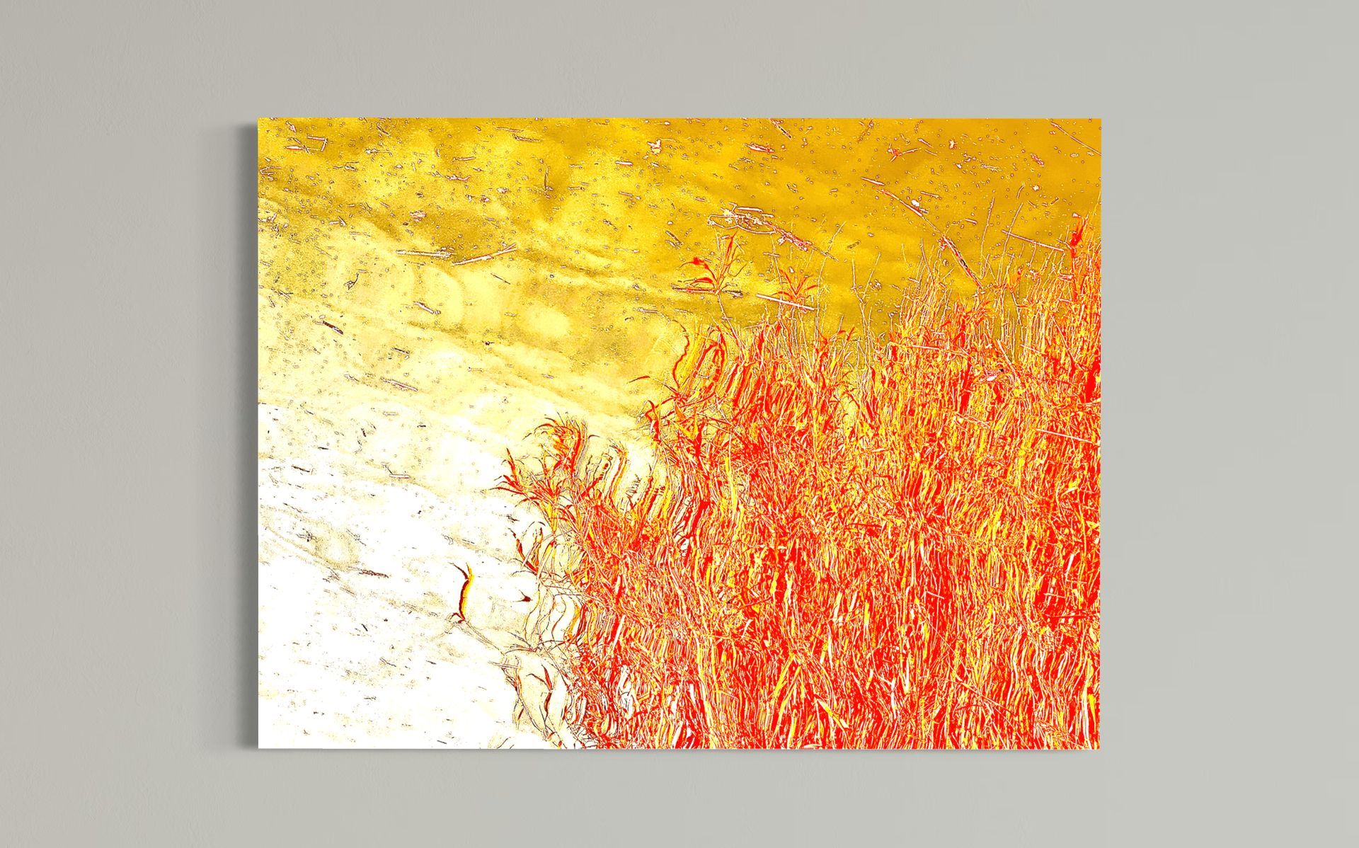 Hoch oben im Norden, bei den Wikingern gibt es dieses ganz besondere Leuchten, dieses Licht dass wenn die Sonne tief steht, seine Bilder in die warme braune Erde des Wattenmeeres malt. Acryl und Metallpigmente auf gebürstetetem Aluminium in Polymer gegossen. 4mm Echtholz- Rahmen in Eiche schwarz.